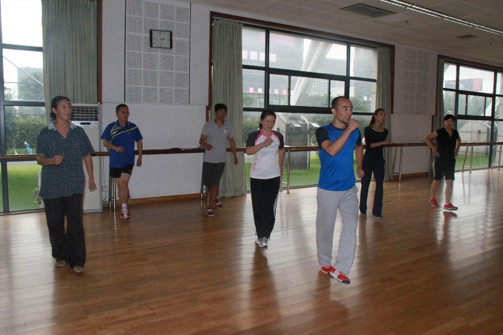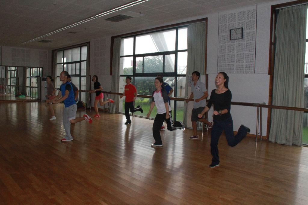首先,叶东惠老师代表部门明确了此次教研活动的重要性,要求全体教师“人人参与、认真参与”,从思想上达成共识。姚智勇老师从项目的特点、功能、目标等方面介绍了武术和健美操在我校开展的可行性、必要性、实效性。从武术、健美操进行教学改革,特别是教考分离的实施的介绍,以及对往年武术与健美操考核成绩比较分析,进一步明确了教学过程中“教”与“学”的密切相关性。然后将全体教师分组进行实践学习与演练。在散打房,以担任男生班为主体的男教师,在应昌达老师的带领下对青年防卫拳的整个套路,逐招、逐式的进行动作演练、讲解、规范。从攻防演练、到实战应用、再到每一动作的发力点,环环相套,最终明确了教学的关键点。在体育舞蹈房,以担任女生班为主体的女教师和部分男教师,在姚智勇老师的带领下,学习新的三套一级大众健身操,从每一动作的规格、协调、律动再到节奏,丝丝入扣,教师细致揣摩,认真练习,反复体会,伴随着动感的音乐,在轻松愉悦的气氛中,取得令人满意的效果。整个教研活动持续了近两个小时。