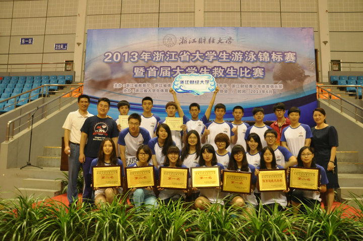 2013年浙江省大学生游泳锦标赛暨首届大学生救生比赛于6月9日在浙江财经大学落下帷幕,本次共有30支队伍参赛。我校共派出了21名优秀的运动员组成的代表队参加比赛。在高手如云的泳池里,我校游泳健儿们凭借刻苦训练的高超技术,以及奋勇拼搏的精神最终夺得甲组11金、12银、4铜、团体总分266分,在金牌总数和团体总分上全部位列全省第一名;同时丁组也夺得5金、3银、3铜的优异成绩。这是我校游泳队建队以来取得的最佳战绩,更奠定了我校竞技游泳水平在全省的领先地位,完成了历史性的突破!