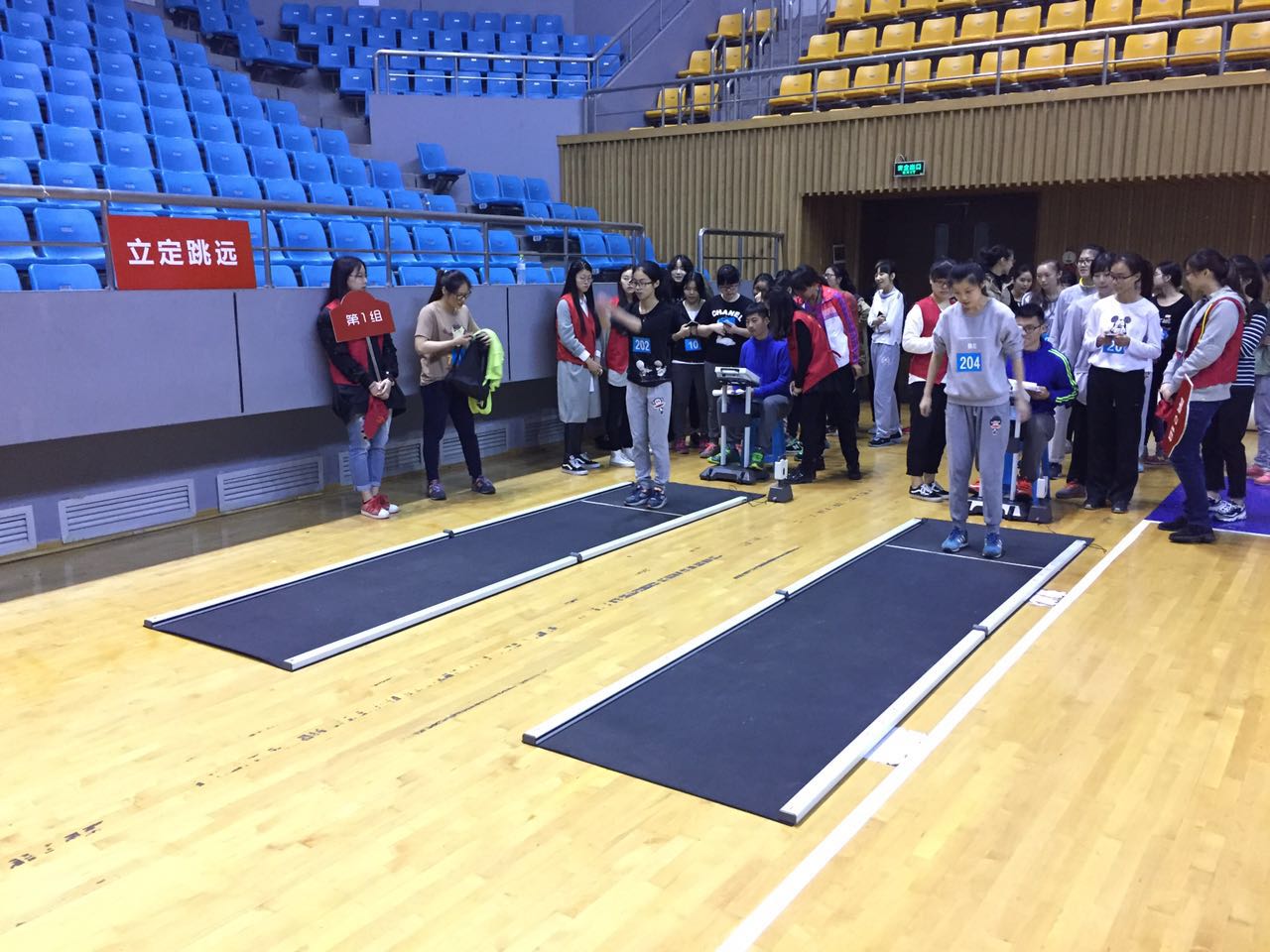 根据专家安排,本次抽测对象为13级学生,共随机抽取了会计学院与工商管理学院的200名学生,按照计划上午进行50米跑、坐位体前屈、立定跳远、引体向上(男)/仰卧起坐(女)等四项测试项目,下午进行1000米跑(男)/800米跑(女)项目测试。由于天公不作美,一早杭州突降倾盆大雨,室外项目测试任务艰巨。经过专家组和部门的认真讨论及有序安排,坐位体前屈、立定跳远、仰卧起坐三项在西体育馆进行,引体向上、50米两项在东体育馆进行,1000米跑(男)/800米跑(女)在西田径场进行。尽管两馆相隔甚远,而且大雨澎湃,但同学们克服各种困难,最终顺利完成了全部抽测工作。