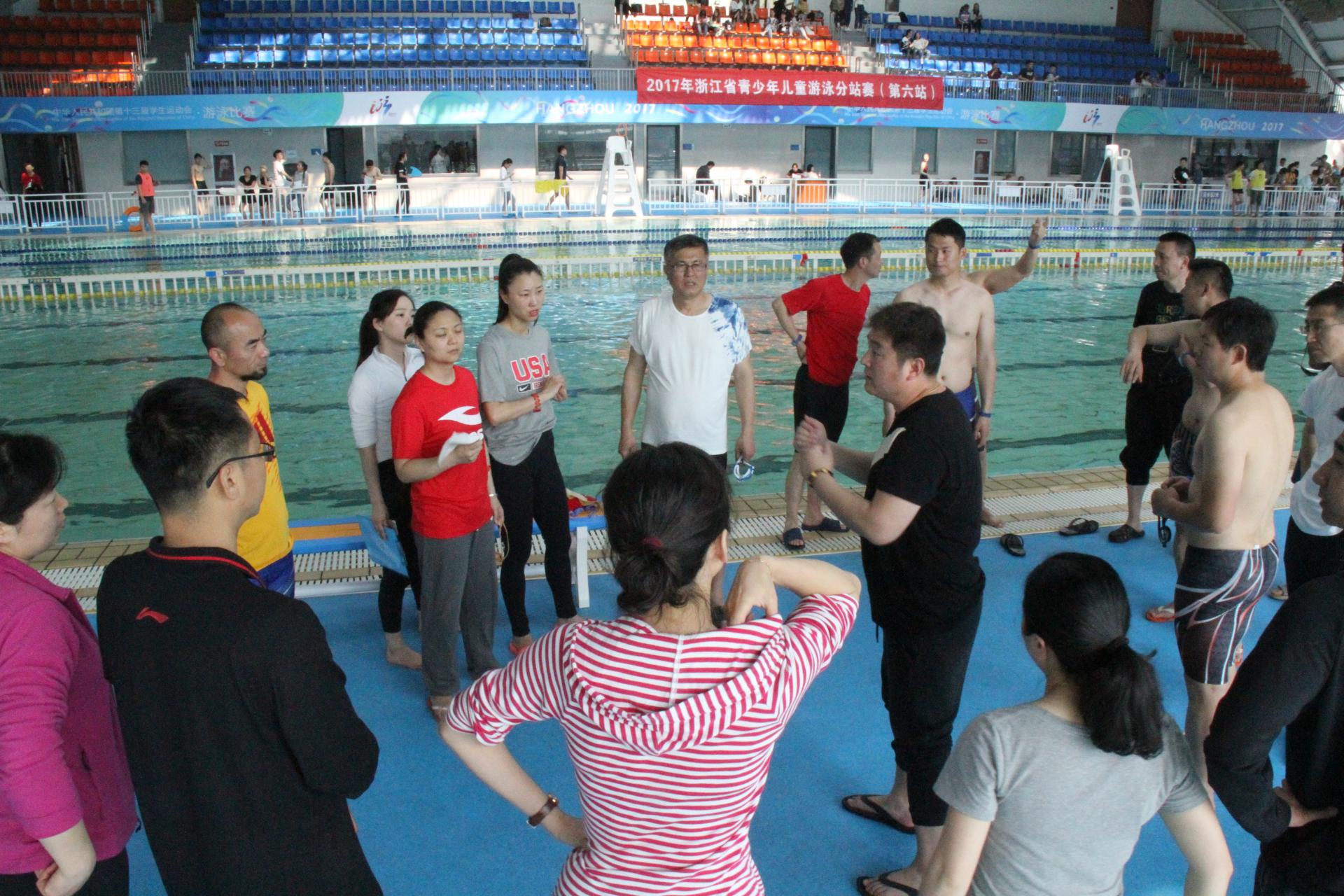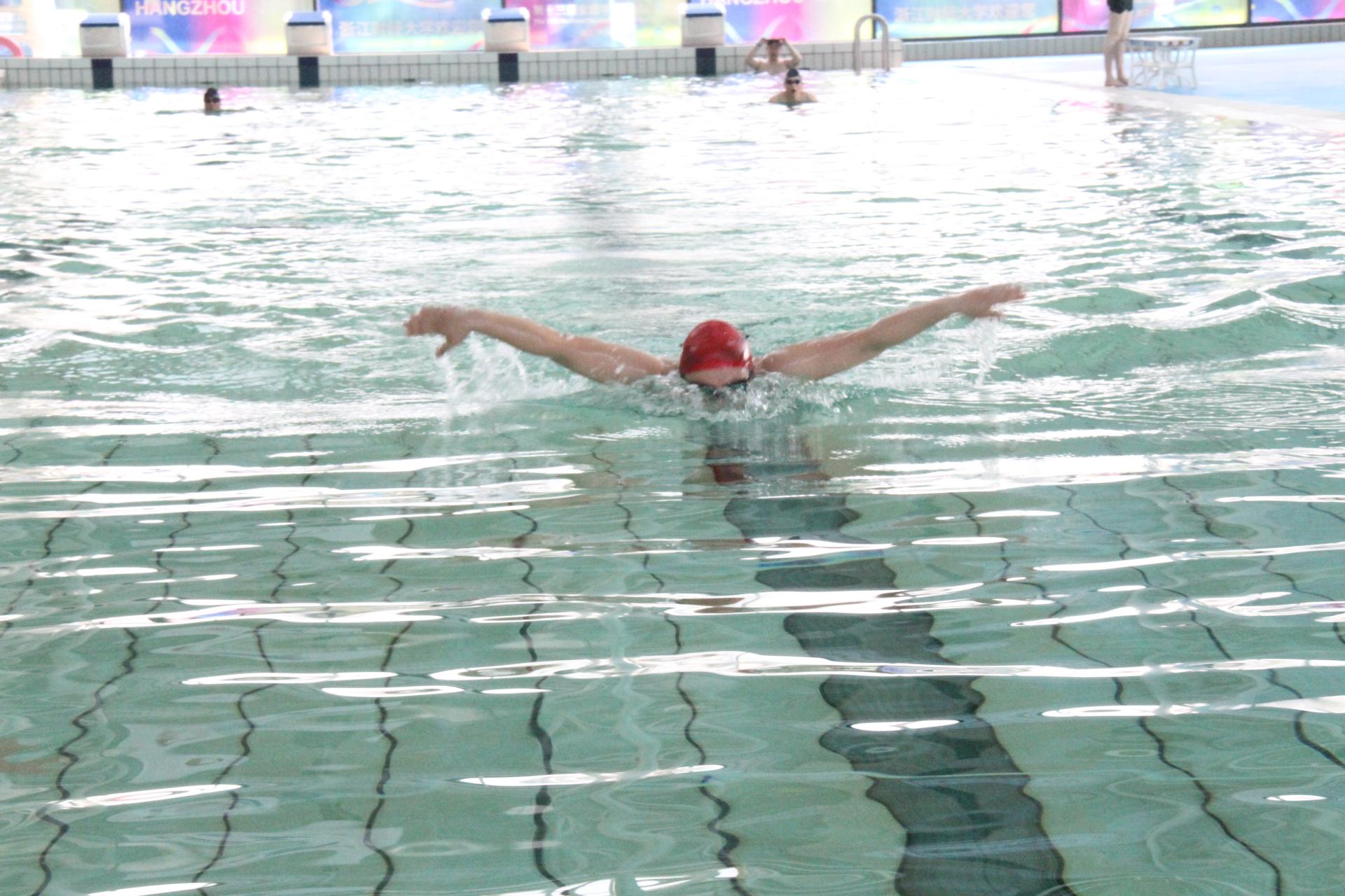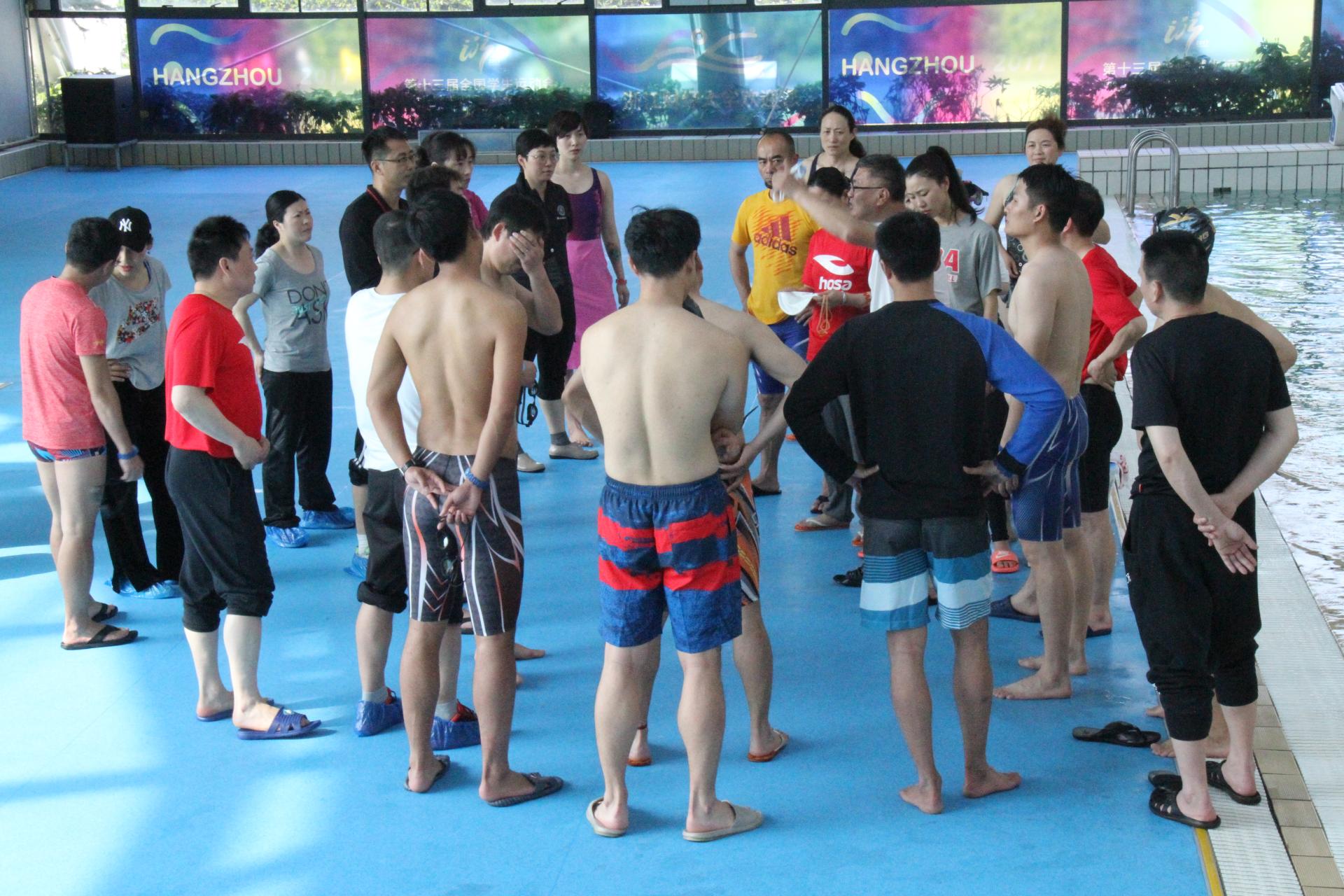 “财大学生人人会游泳”是目标,“财大体育老师人人会教游泳”是基础。在游泳教研组的组织下,部门全体教师下水实践,深入学习解读游泳技术,并进行了一场别开生面的体育教师游泳技术比赛。赛间,游泳专业教练员左宇飞老师根据每位老师的泳姿进行了一一点评、指正,让教师们的泳姿得以进一步规范。