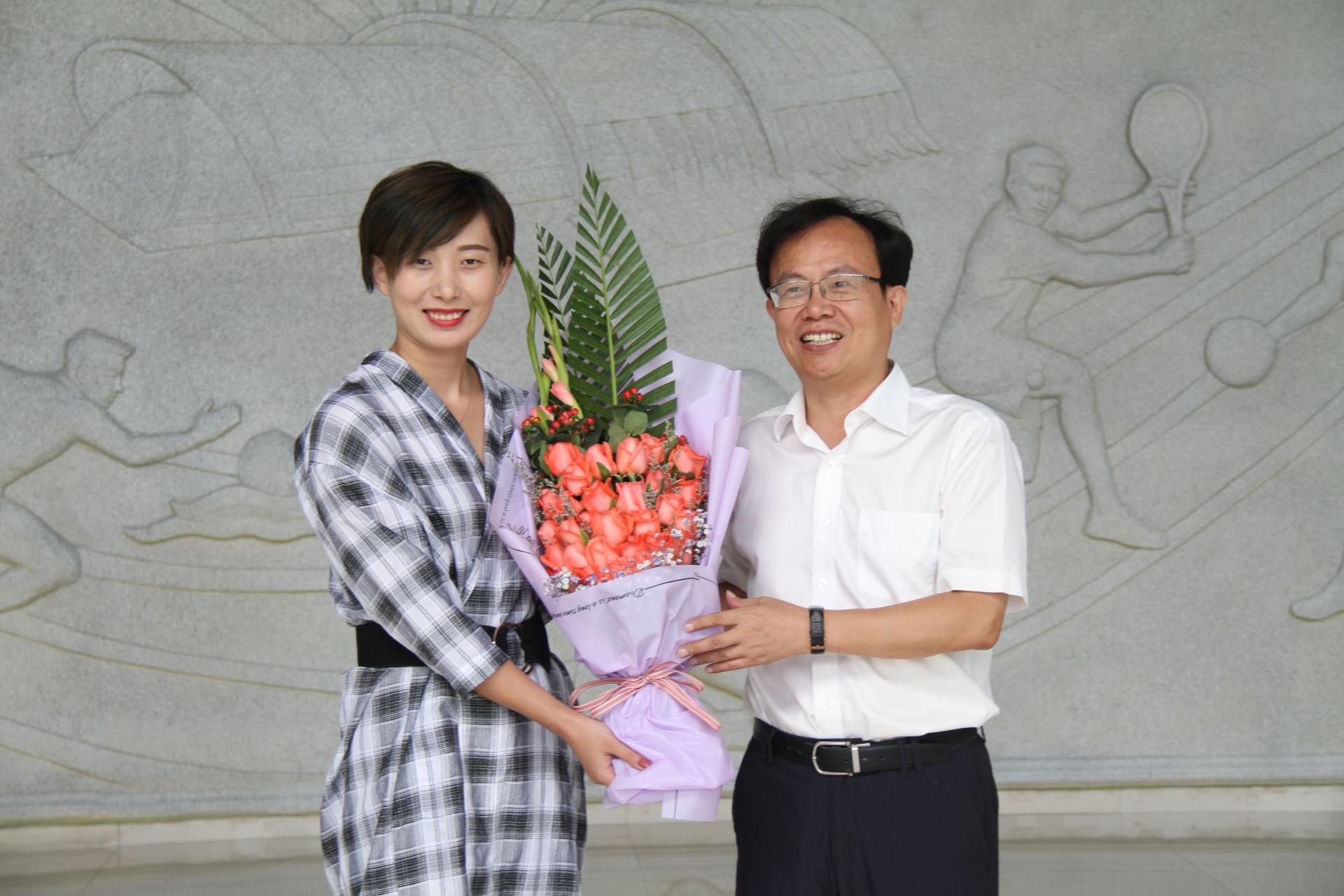 黄建新副校长向佀慧老师献上鲜花,感谢其为177漫画 体育事业及跆拳道项目的辛勤努力与付出。慰问会谈中,黄校长热情询问了部门暑期工作及开学准备情况,并充分肯定了我校的体育工作。