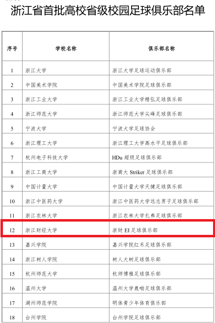 近日,省教育厅公布了浙江省首批高校省级校园足球俱乐部名单,我校“浙财EI足球俱乐部”名列其中。
