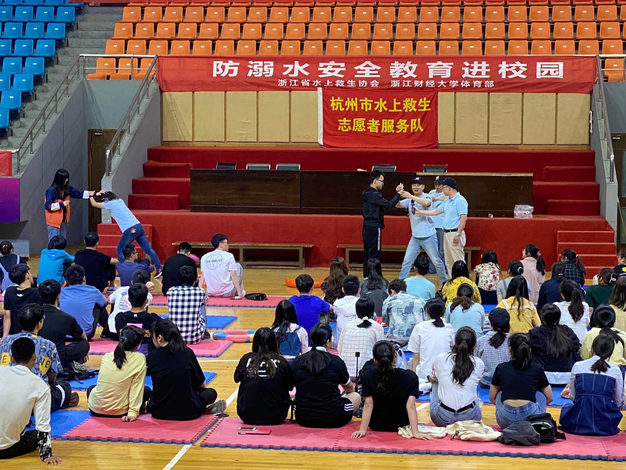 邀请杭州市水上救生志愿服务队到财大开展防溺水安全教育活动。