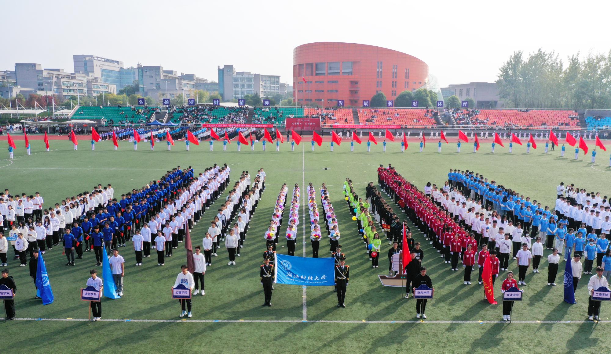伴随着慷慨激昂的运动员进行曲,国旗护卫队、校旗队、鲜花队、红旗队先后入场。各学院学生方阵迈着整齐的步伐,昂首挺胸、精神抖擞地依次走过主席台。