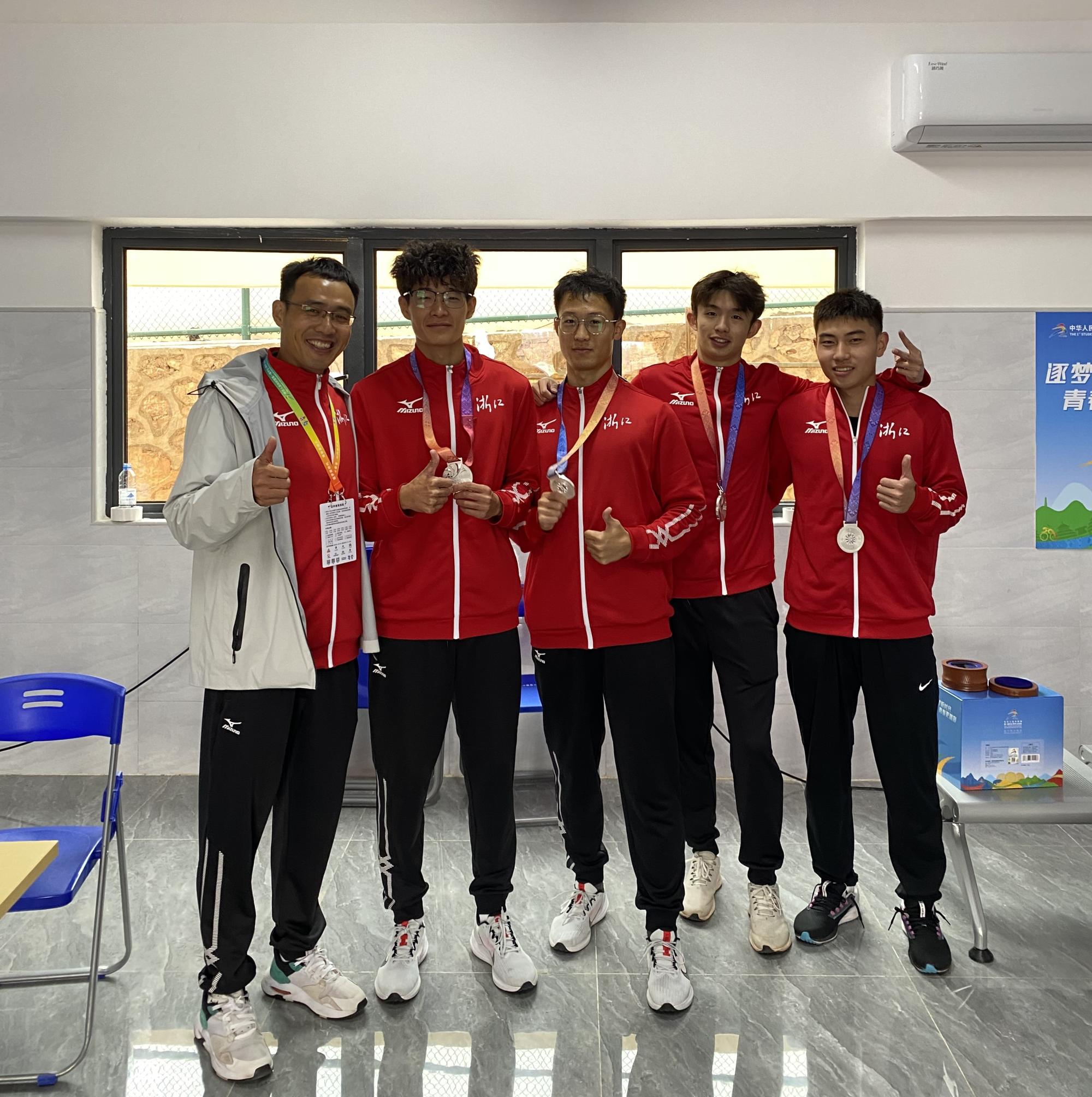 田径比赛中,在赵凌强教练的带领下,我校法学院研究生陈舒昂获得乙组男子400米栏决赛第六名,还代表浙江队获得乙组男子4x400米接力亚军。