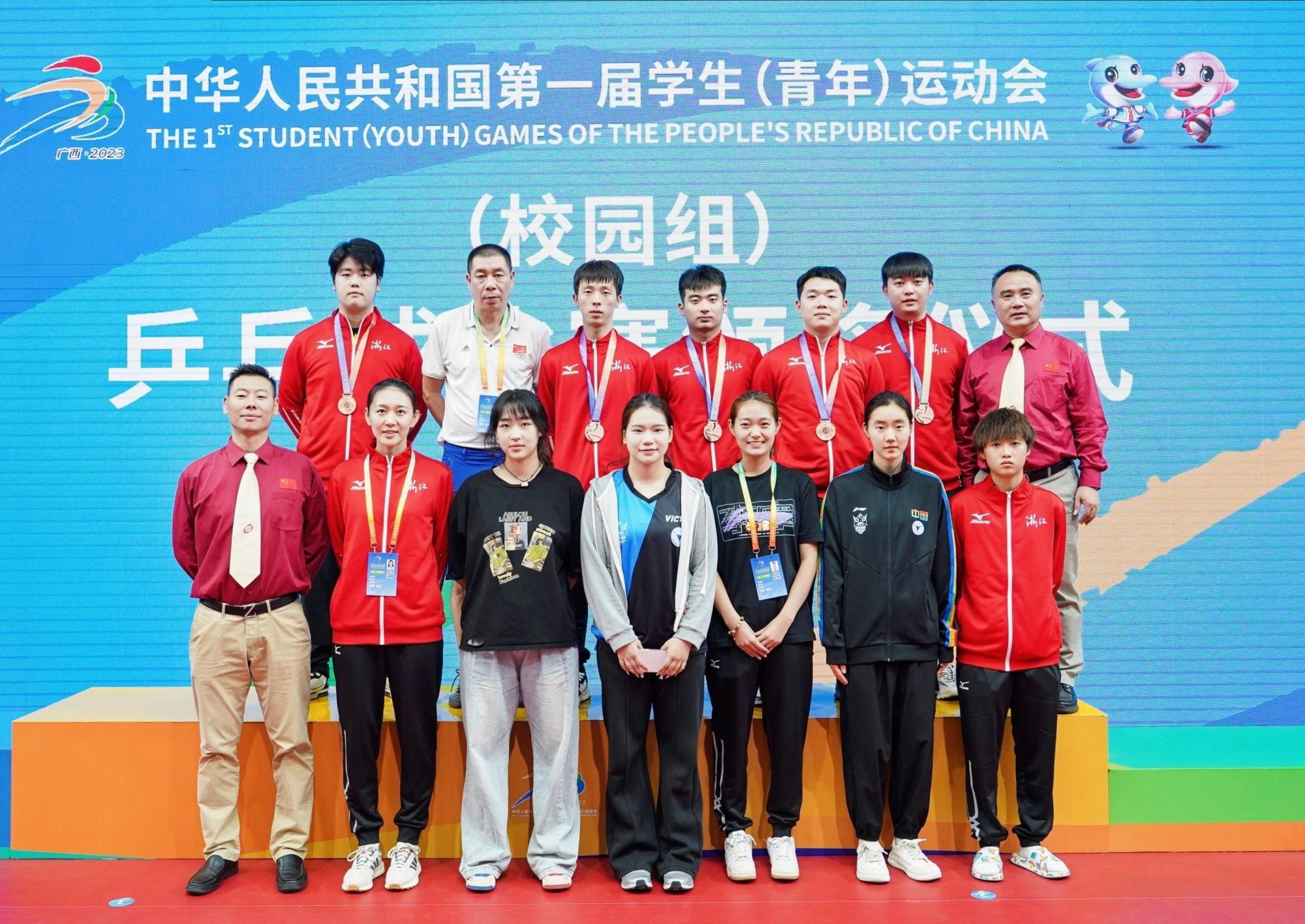 乒乓球比赛中,在武翟教练的带领下,我校工商管理学院须盛昂同学代表浙江队夺得甲组男子团体铜牌。