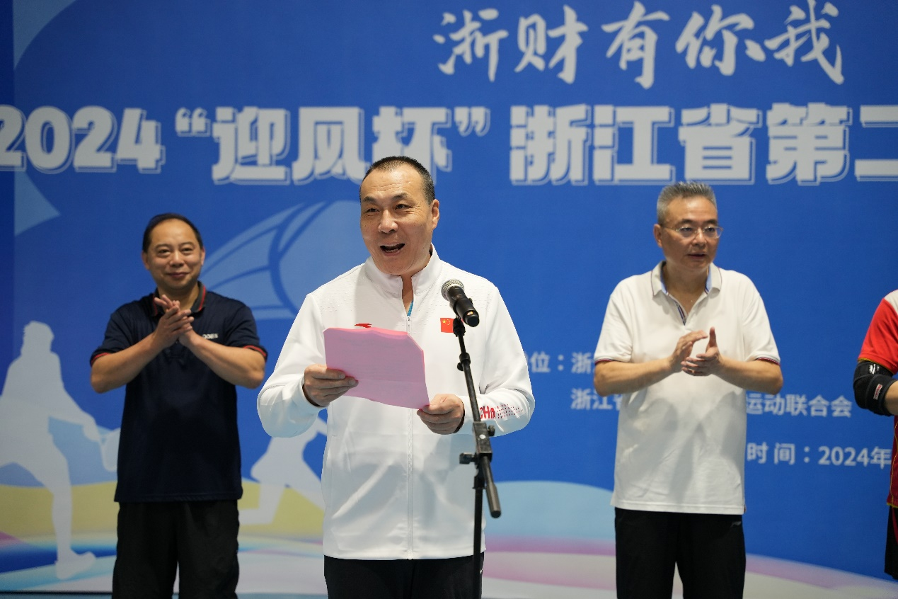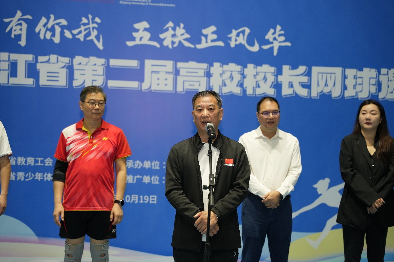 下沙校区北体育馆举行。省政协副主席叶正波,省工商联副书记、副主席、一级巡视员蔡晓春,省总工会常务委员、二级巡视员、省教育工会主席、省钟声体协主席王玉庆,省青少年体育运动联合会会长鲍学军、校党委书记李金昌、省体育局竞赛处处长毛鹏飞、迎风基金捐赠单位万合集团营销总经理刘果佳出席开幕式。