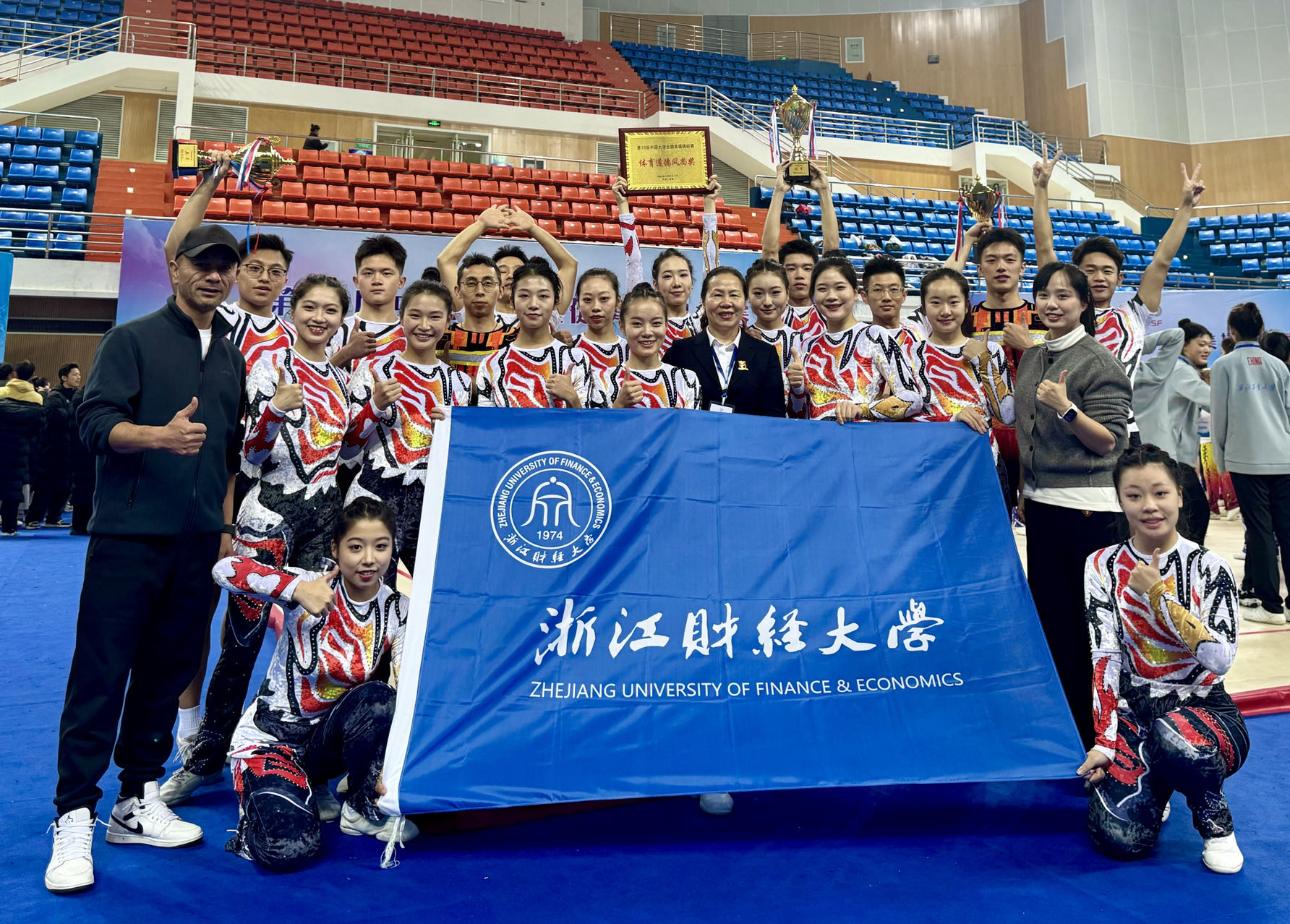 健美操队的运动健儿们奋力拼搏,获得甲组团体总分第一名,并获“体育道德风尚奖”荣誉称号。