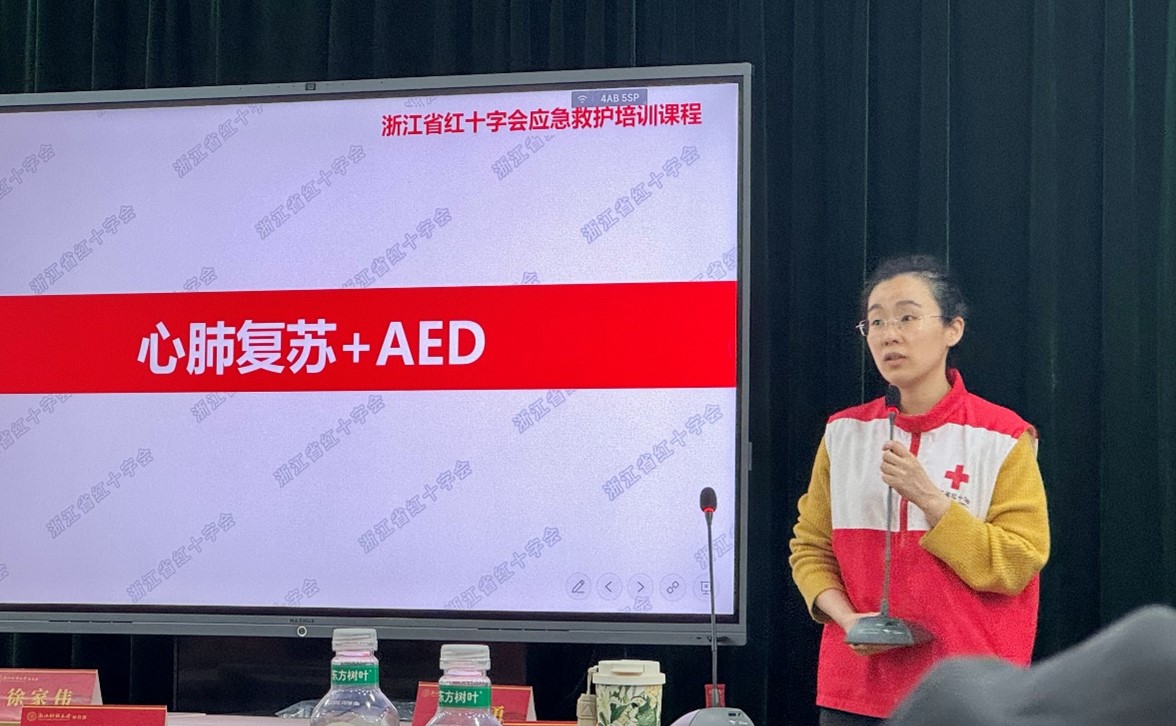 培训邀请了浙江省红十字会人员进行心肺复苏和AED的急救讲解。培训人员详细介绍了心肺复苏的原理、操作流程及注意事项。老师们结合工作中的实际案例,积极与培训人员进行交流,现场学习氛围十分浓厚。