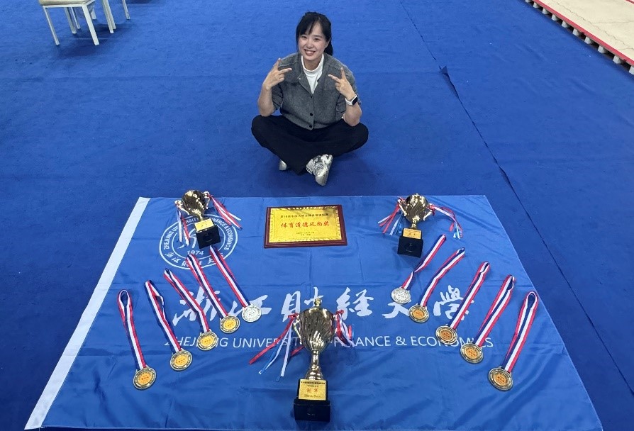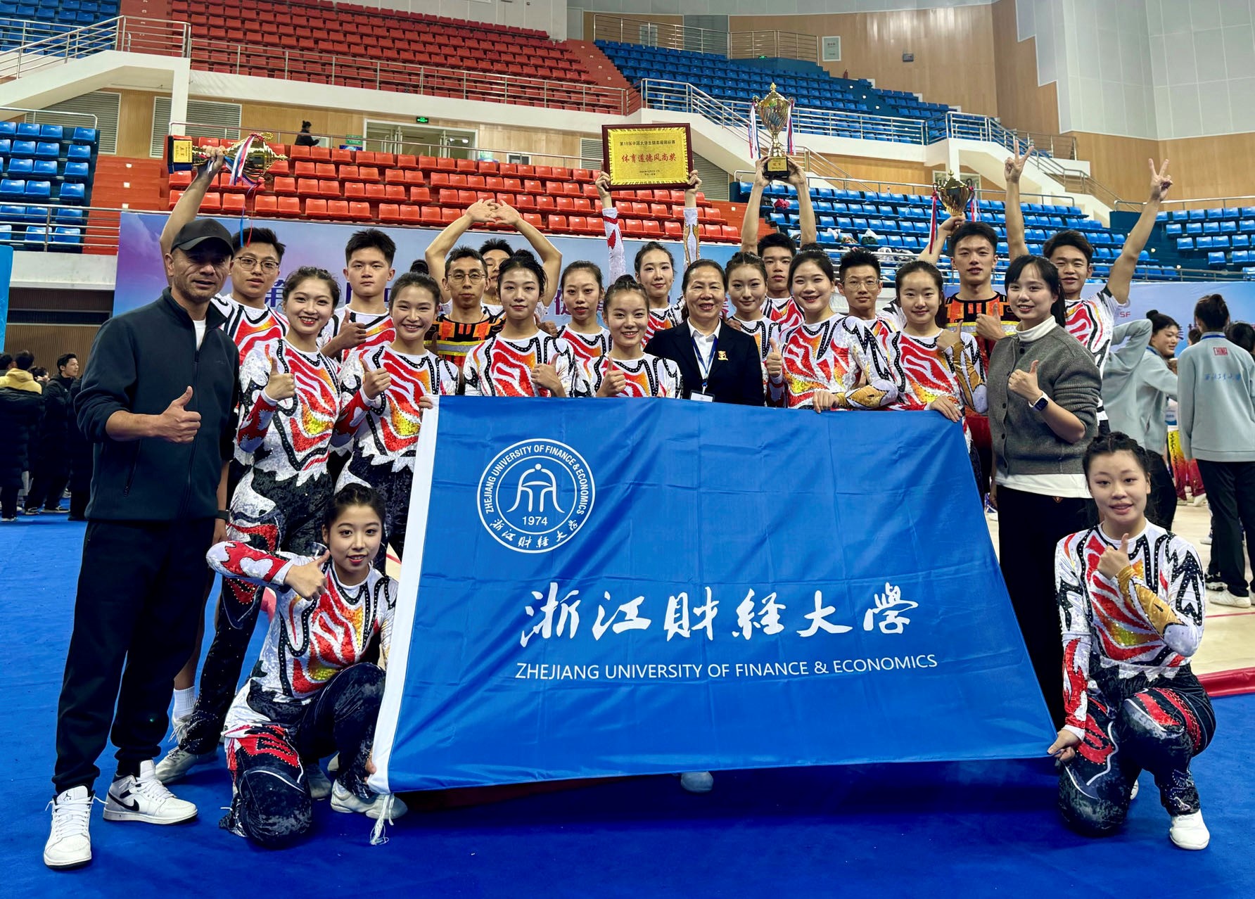 健美操队是一支具有优良传统和辉煌战绩的运动队,我们以“姚家军”自称,在队训“精英强将,舍我其谁;百炼成钢,为校争光”的激励下,铸就坚韧不拔、持之以恒、团结奋进、勇攀新高的意志品质,并成为懂感恩、乐奉献、负责任、有担当的新时代青年。自1998年建队以来,共获得省级赛事43金32银17铜,国家级赛事35金19银15铜(截止2024年)。
