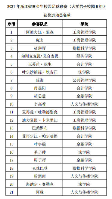 10月30日至11月6日,2021年浙江省青少年校园足球联赛大学男子校园B组比赛在东阳市举行。经过8天的激烈角逐,我校男子足球队勇夺冠军。赵琳晖荣获“最佳球员”称号,艾再尔江·帕尔哈提、赵琳晖、叶尔沙纳提·坎吉汗、肖昱阳等四名运动员荣获“优秀运动员”称号。