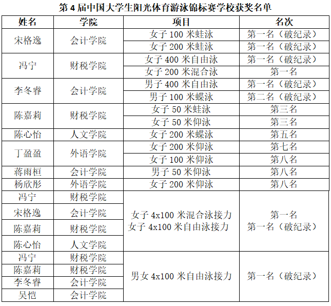 游泳健儿摘得8金1银2铜,获团体总分第一名、女子团体总分第一名、男子团体总分第五名。会计学院宋格逸同学打破女子100米蛙泳、女子200米蛙泳两项赛会纪录,会计学院李冬睿同学打破男子400米自由泳、男子100米蝶泳两项赛会纪录,财税学院冯宁同学打破女子400米自由泳赛会纪录,177漫画