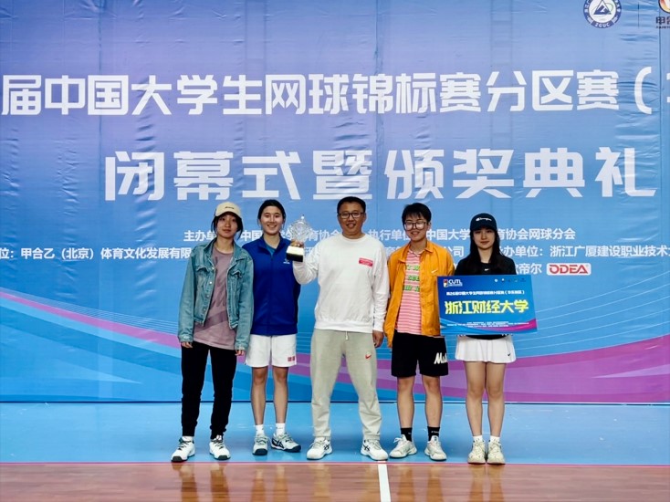 在罗旭教练的指导下,我校网球队在比赛中顽强拼搏,表现优异,先后战胜了浙江水利水电学院、浙江科技学院、浙江理工大学、宁波大学,夺得女子普通组团体第二名的好成绩。