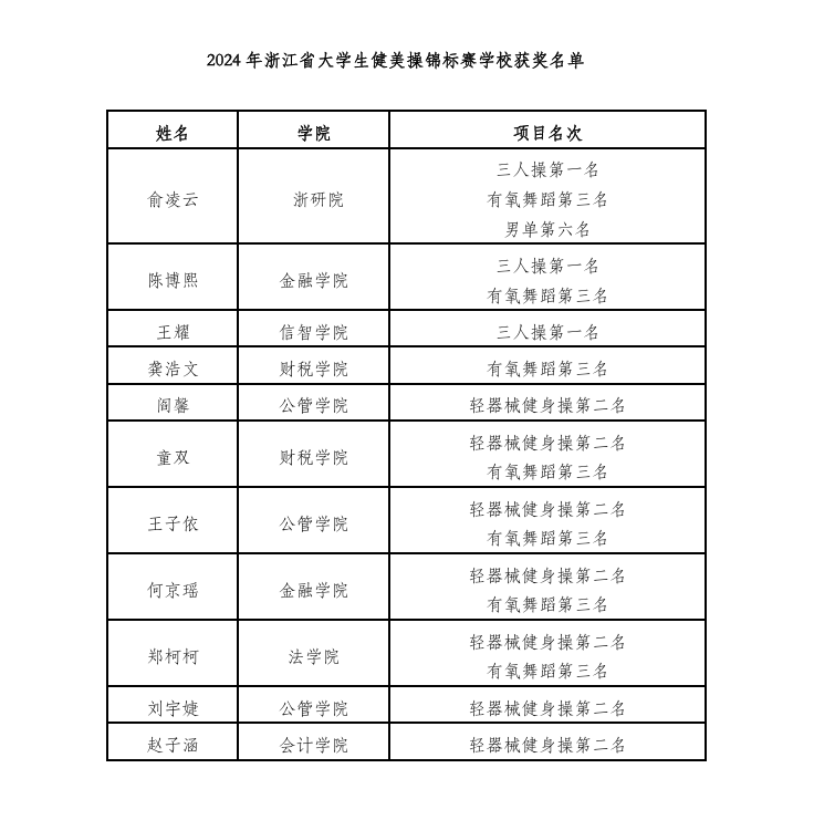 11月20日至23日,2024年浙江省大学生健美操(甲丙组)锦标赛在浙江师范大学举行,我校健美操队的运动健儿们奋力拼搏,最终取得1金1银1铜和1个第6名的佳绩,姚智勇老师荣获“优秀教练员”称号,俞凌云、孙瑾呈获得“优秀运动员”称号。
