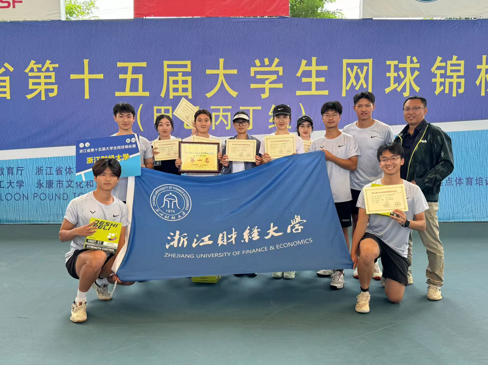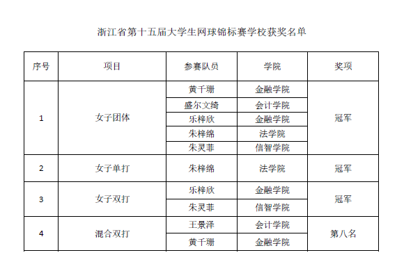 5月19日至24日,浙江省第十五届大学生网球锦标赛在金华永康举行,我校运动健儿奋勇拼搏,共获得女子团体冠军、女子单打冠军、女子双打冠军、混合双打第八名的佳绩,罗旭获“优秀教练员”称号,盛尔文绮、张黎博获“优秀运动员”称号。