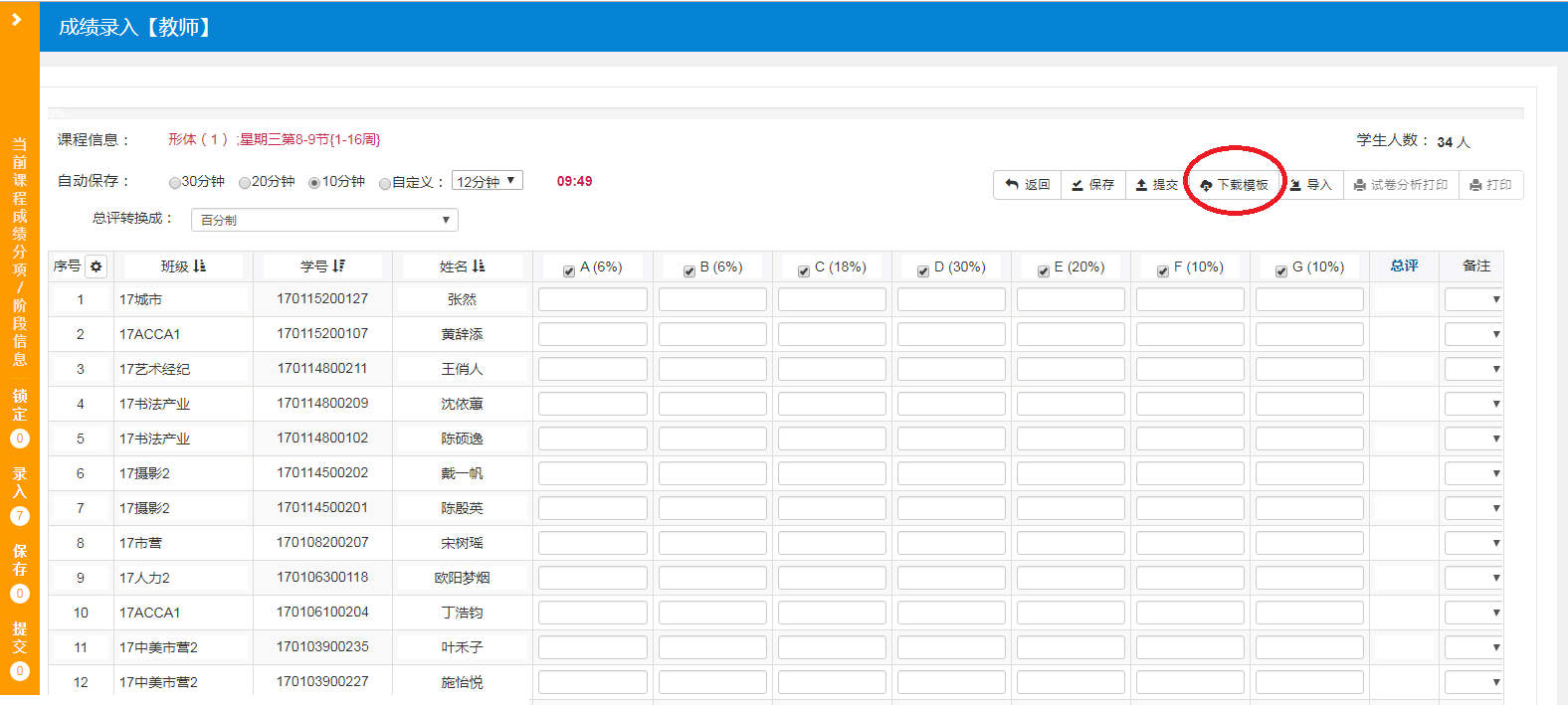 5、设置比例后,即可输入成绩,也可选择【下载模板】输入,然后【导入】