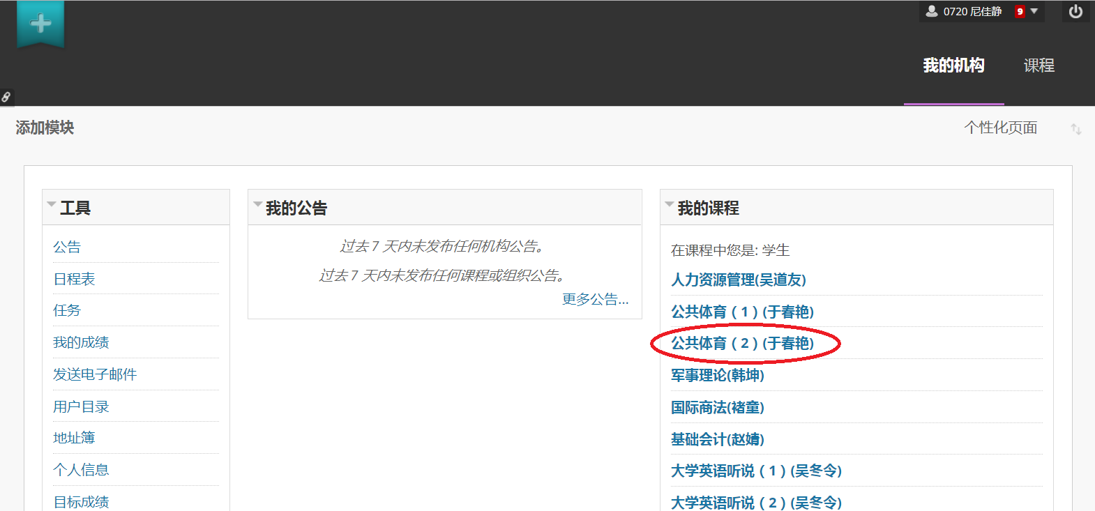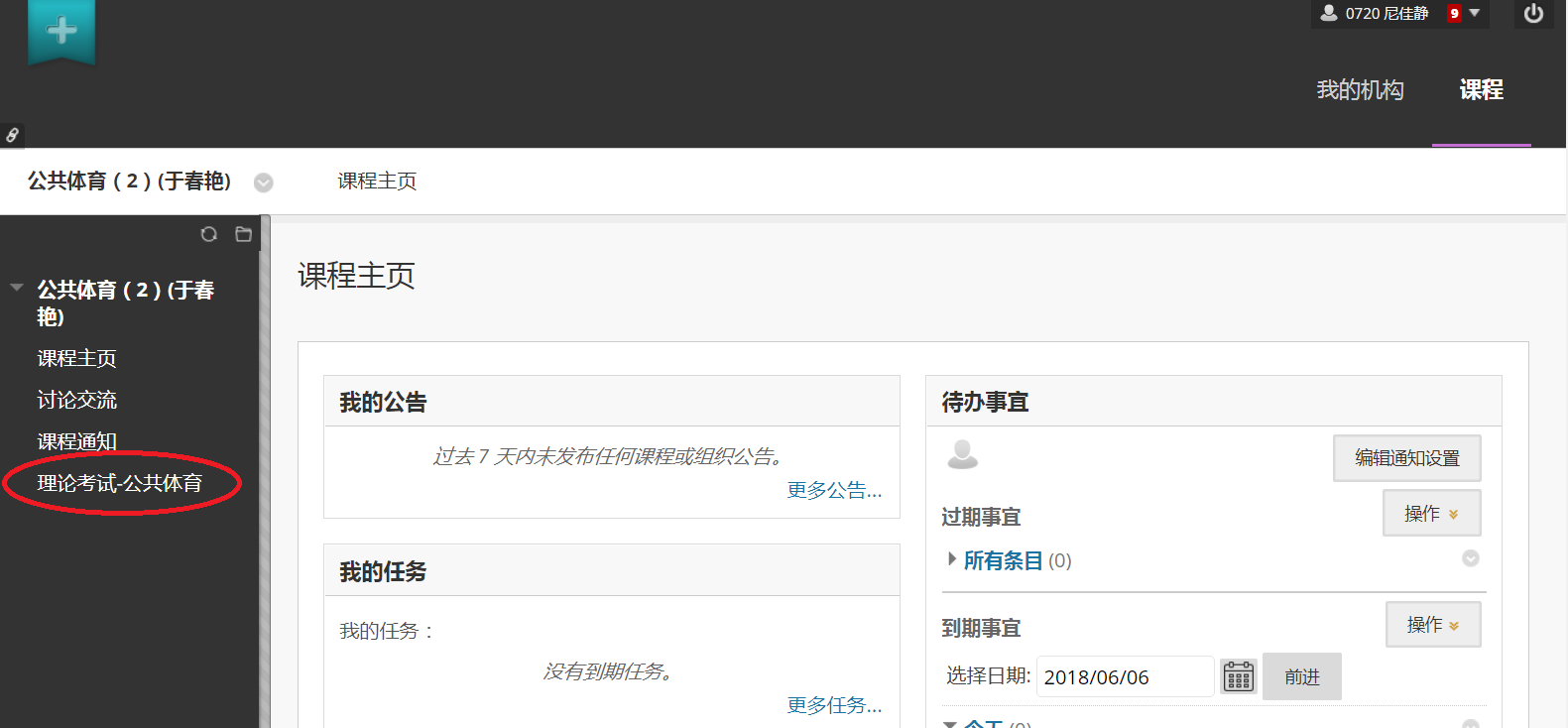 2、进入平台后,课程列表中找到考生对应所在的课程,找到考试栏目。