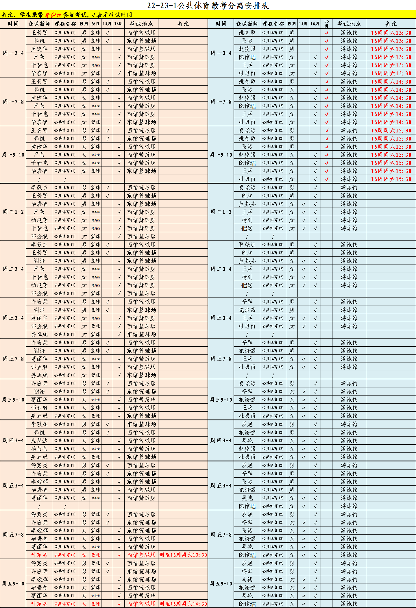 3.公共体育(2)-游泳:女生班安排在第15-16周,男生班安排在第16周,周一班级另作调整,详见附件一。