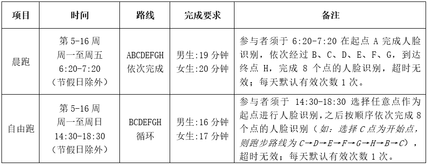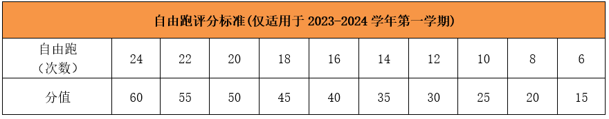 课余体育锻炼(100分)=晨跑(40分)+自由跑(60分),晨跑12次(40分)为必选内容(必须完成晨跑12次,否则课余体育锻炼0分),自由跑24次(60分)为自选内容,评分标准参照下表: