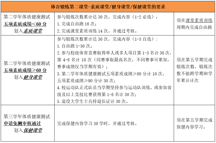 第二学年体质健康测试五项素质成绩<60分划入素质课堂(请相关学生加QQ群:895749685,及时了解素质课堂教学安排),五项素质成绩≥60分划入健身课堂,第三学年体质健康申请免测审核通过划入保健课堂(请相关学生加QQ群:1012987465,及时了解保健课堂教学安排),须按要求参与锻炼,具体要求参照下表: