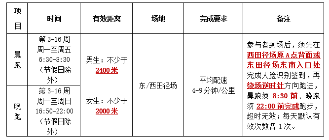 为落实体质健康促进工程,加强课余体育锻炼管理,经研究决定于2024-2025学年第二学期第3-16周开展课余体育锻炼。课余体育锻炼占【体育课程】总成绩18分,且为【体育锻炼】第二课堂素质课堂的必选内容及健身课堂的自选内容,本学期课外锻炼在场地、时间、完成要求上做了调整,采用人脸识别现场打卡和开启小程序记录跑步轨迹相结合的形式,望各学院、各班级组织同学仔细查看以下内容,积极参加。