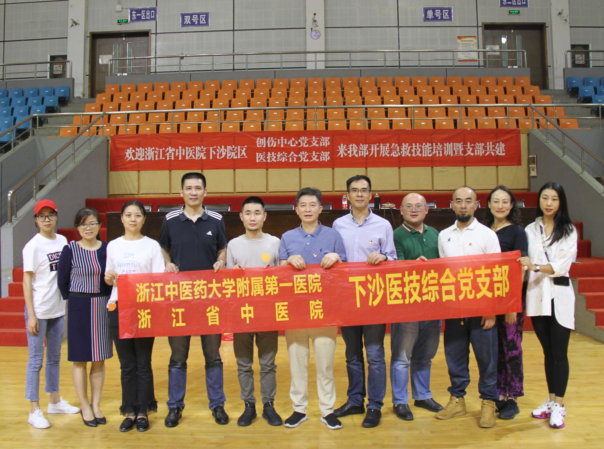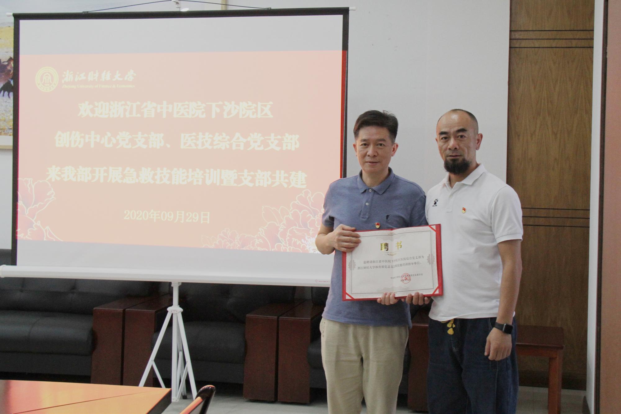 副主任徐家伟、副主任姚智勇分别浙江省中医院下沙院区创伤中心党支部、医技综合党支部颁发急救技能培训指导单位聘书。