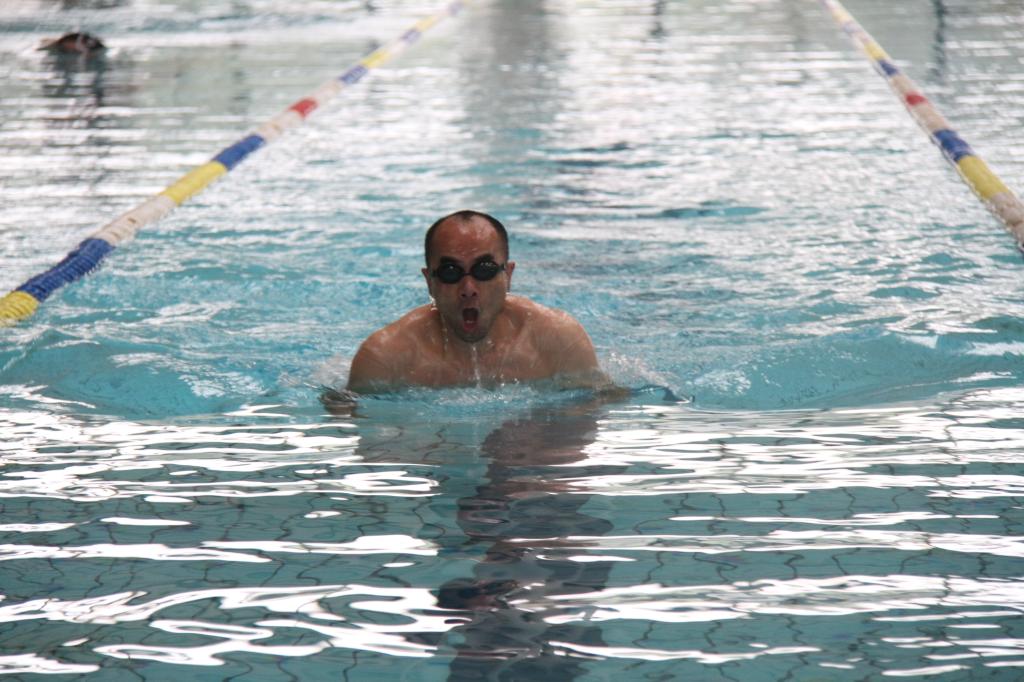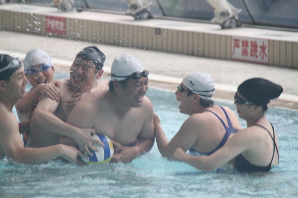 本次水上健身系列活动包括蛙泳接力(50M)、水上排球、池底捞宝、定格一瞬四个项目。活动第一项是50M蛙泳接力赛,比赛还未开始,泳池边已呈现一片欢乐沸腾的景象,选手们个个摩拳擦掌、舒展筋骨,做足赛前热身运动,欲一展矫健身手。第二项水上排球赛将活动的气氛推向了高潮,随着裁判一声令下,双方队员的焦点都聚集在排球上,泳池瞬间被激荡起无数浪花,现场呐喊声、欢呼声不断,场面热闹非凡。第三项池底捞宝,考验参赛者的憋气能力,参赛者需要一次潜水捞池底的鹅卵石,捞到鹅卵石多者为胜。各队派出的队员各显神通,有水下吸尘器般横扫池底者,也有美人鱼般姿势优美者,让大家连连赞叹。定格一瞬这个项目伴随着整个比赛,各种精彩瞬间被大家的相机、手机所捕捉,在活动结束后制作成微电影,留下这美好的回忆。