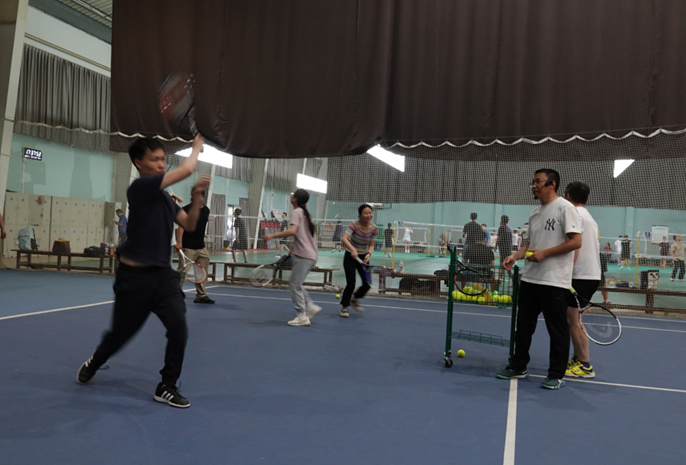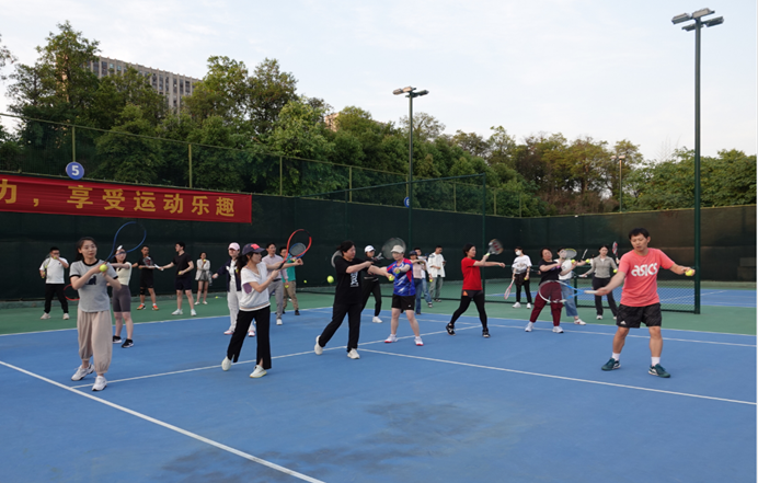 徐家伟、罗旭、韩坤三位老师带领大家进行握拍、站位、基本步伐、球感、正手击球等基础技能的学习。授课老师细心讲解、耐心示范,参加培训的教工认真听讲、积极尝试,整个教学过程轻松和谐。
